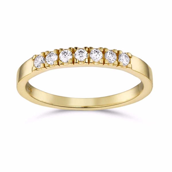 Smuk alliancering i forgyldt 925 Sterling Sølv med hvide funklende zirkonia sten placeret langs toppen af ringskinnen. Det enkle og elegante design gør ringen ideel til stacking og nem at kombinere med andre ringe. Perfekt som et stilrent hverdagslook, et romantisk vielsesring-look eller som en tidløs gave. Den fine balance mellem klassisk og moderne gør ringen til et must-have i enhver smykkesamling.