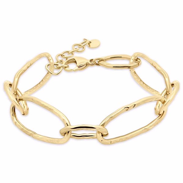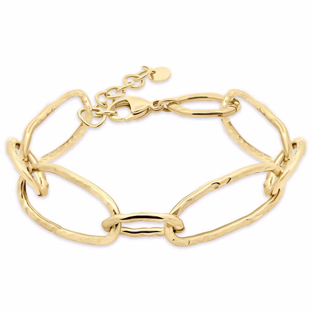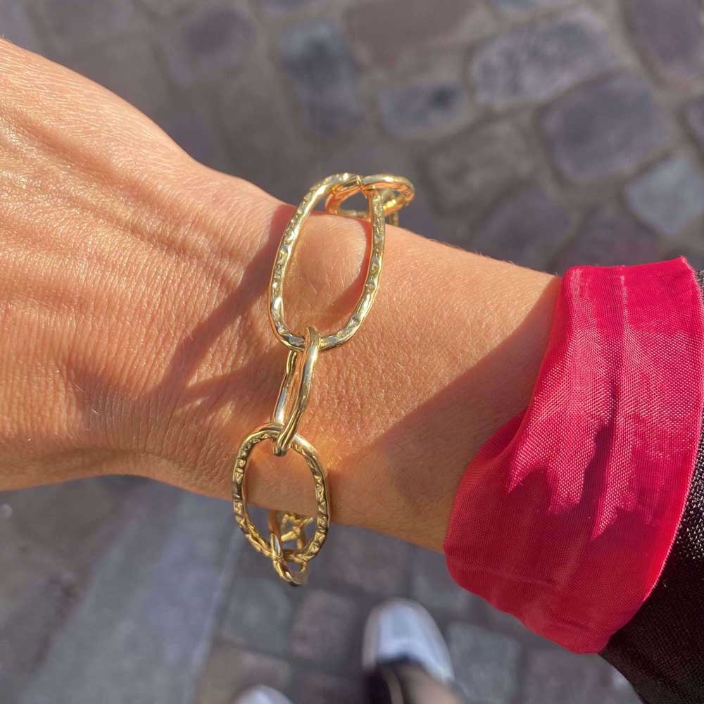 Markant kædearmbånd fra CO88 i PVD guldfarvet Stål med en rustik og struktureret overflade. De formstøbte, ujævne led skaber et levende og grafisk udtryk, mens den varme guldfinish tilfører elegance. Armbåndet kan bæres alene som et statement-smykke eller styles med andre accessories for et personligt look. De organiske former giver flot bevægelse og karakter, perfekt til både hverdag og fest. Justerbar længde: 20,5–23,5 cm. Et ideelt valg til dig, der ønsker et edgy, stilfuldt smykke med kant.