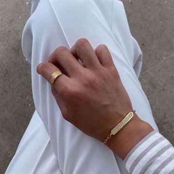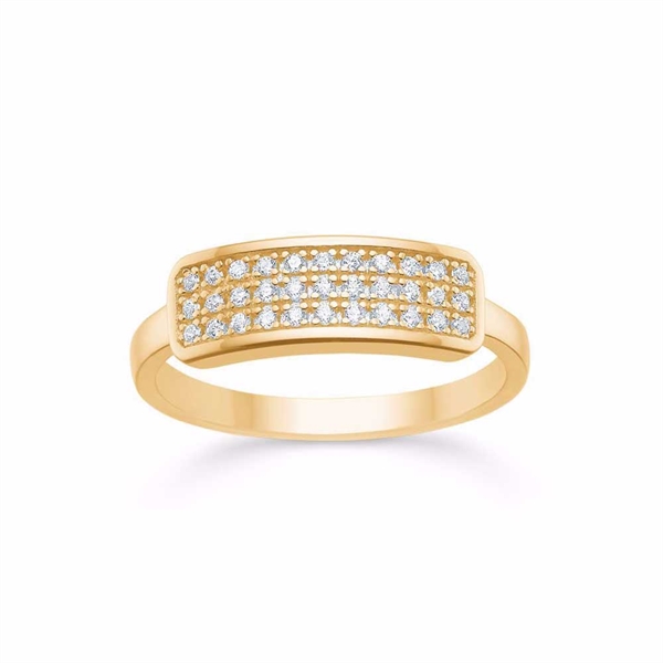 Fin og elegant ring i forgyldt sølv med et smukt buet design. Ringen er prydet med tre rækker funklende zirkonia sten, som giver et eksklusivt og feminint udtryk. Den polerede overflade fremhæver ringens glans og sikrer et stilrent look. Perfekt til både hverdag og fest – brug den alene for et klassisk udtryk eller kombiner med andre ringe for et mere personligt og moderne look.