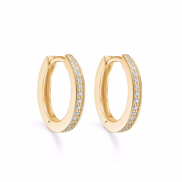 Fine creoler i forgyldt sølv besat med funklende zirkoniasten fra Guld & Sølv Design. Med en diameter på 15 mm og en bredde på 2 mm får du et let og elegant udtryk, der passer perfekt til både hverdag og fest. Den gyldne finish kombineret med de klare sten giver et eksklusivt look. Bær creolerne alene for et stilrent udtryk eller kombiner dem med andre øreringe for et moderne og personligt look. Fås også i sølv.
