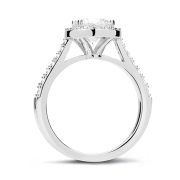 Denne elegante forlovelsesring er lavet i Sterling sølv, besat med én stor rund zirkoniasten omgivet af talrige små funklende sten.