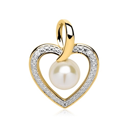 Vedhæng i 14 kt. Guld med Hjerte, Ferskvandsperle og Diamanter.