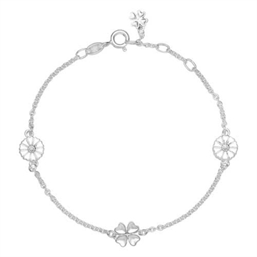 Fint Marguerit armbånd i forgyldt Sølv med 2 hvide Margueritter og Firkløvere.