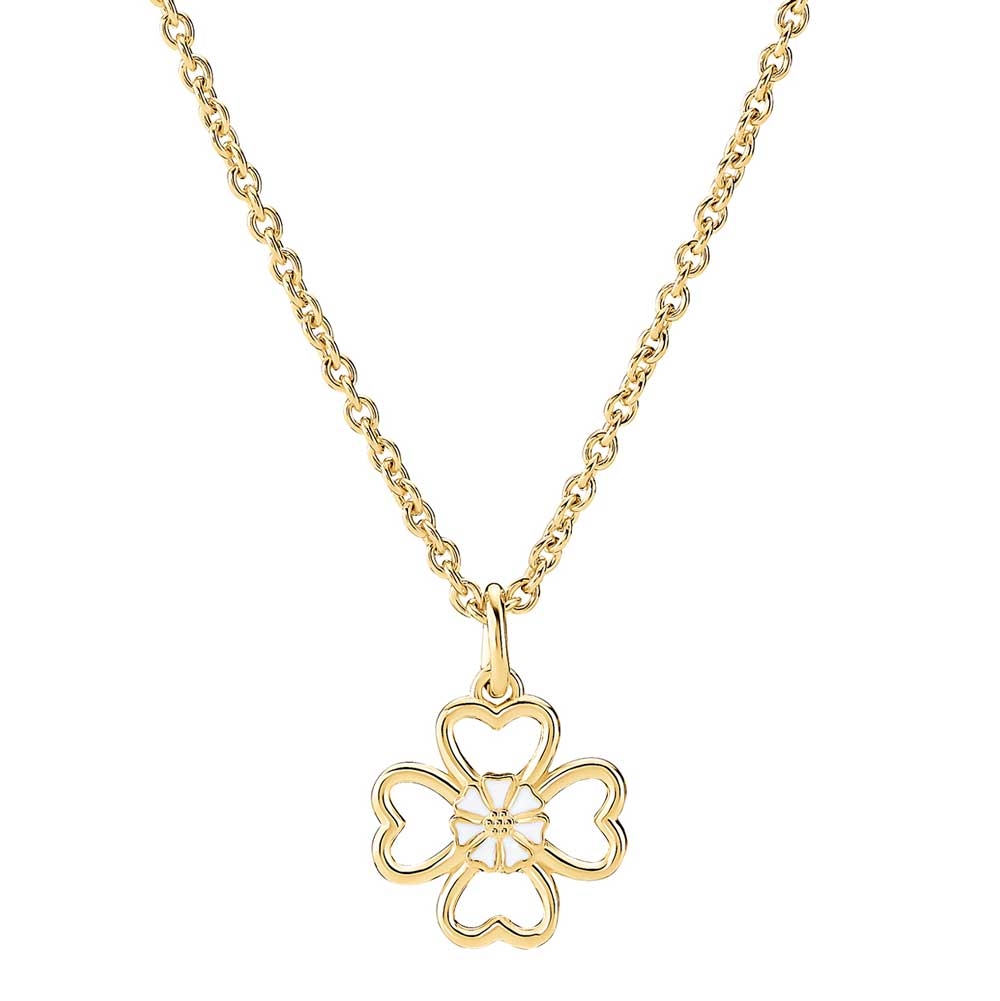 Marguerit Halskæden med Kløver har et elegant design, hvor kløveren består af fire smukke hjerter, der omkranser den lille marguerit. Både kæden og kløveren er fremstillet i 24 karat forgyldt Sølv, mens margueritten er sirligt håndmalet med ægte emalje. Halskæden kan justeres til længderne 45 og 48 cm.