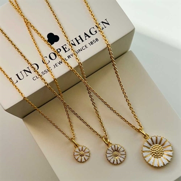 Forside » SMYKKER » Margueritsmykker » Marguerit Halskæder Marguerit Halskæde i 24 kt. Forgyldt Sølv med Margueritvedhæng Varenr.: 96712-FS-925Forv. Lev. 1 til 2 dage 1stk Forhandlerpris 825,00DKK(ex. moms)1.100,00 Vejl. pris 1050DKK BARTOLI Copenhagen - +15 år online Kundeservice - 29 700 209 Forsendelse med Trackingnummer 14 dages retur- & ombytningsret info Marguerit Halskæde i 24 kt. Forgyldt Sølv med Margueritvedhæng Elegant Marguerit halskæde fra LUND COPENHAGEN, udført i 24 karat forgyldt Sterling Sølv. Vedhænget prydes af en smuk Marguerit med en diameter på 11 mm, med poleret og emaljeret overflade, der giver et klart og funklende udtryk. Halskæden kan bæres i længderne 45 eller 48 cm, hvilket gør den nem at tilpasse til enhver stil og anledning. Et tidløst og feminint smykke, perfekt alene eller sammen med andre smykker fra Marguerit-serien. BY LUND COPENHAGEN 902011-M Alle margueritter fra Lund Copenhagen er i 24 karat forgyldt Sølv og håndmalet med ægte emalje. Produkttype Collier Materiale 925 - Sølv 24 karat forgyldt Overflade Poleret og emaljeret Tykkelse Bredde Marguerit: 11 mm Længde 45 og 48 cm Højde Sten Carat Vægt 5,3 gram Måske er du også interesseret i følgende produkter Lund Marguerit Halskæde i Sølv 1.100,00825,00DKK