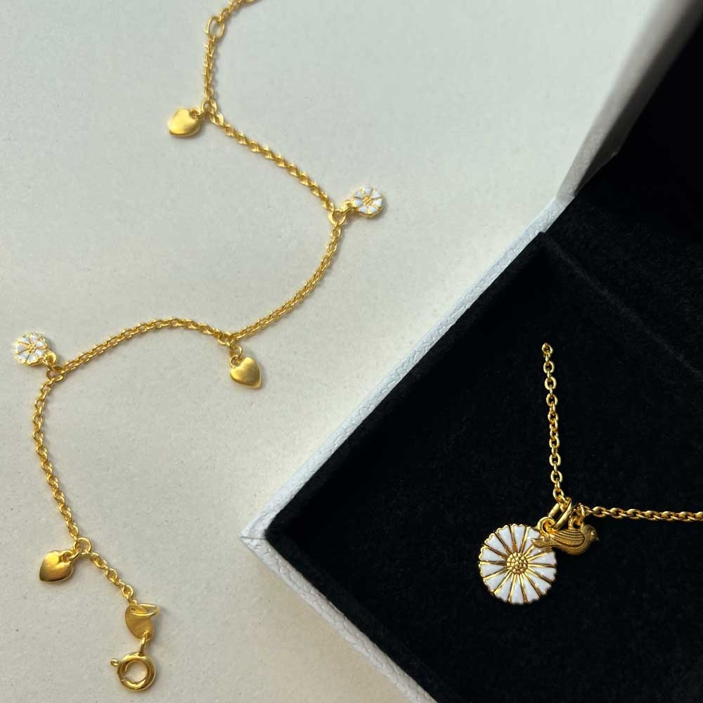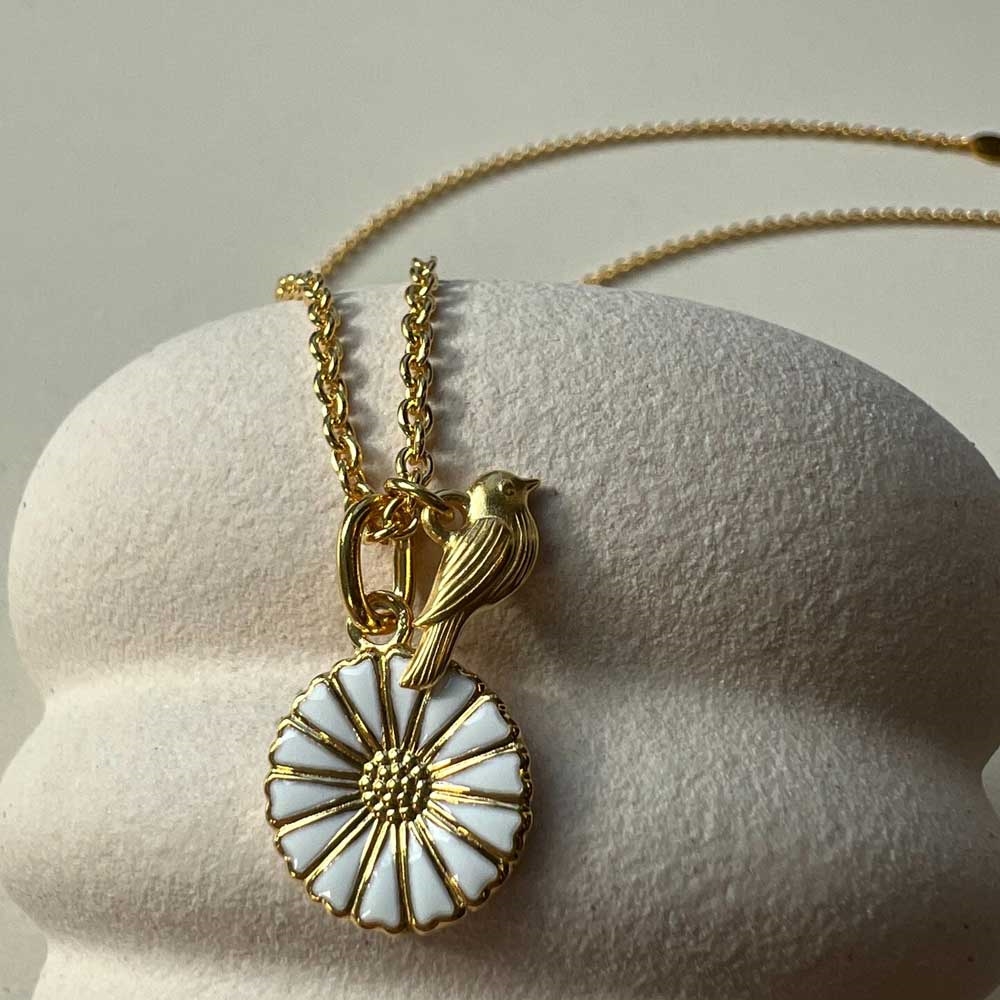 Elegant halskæde i 24 karat forgyldt Sølv, designet med en smuk Marguerit og en yndig Fugl placeret side om side.