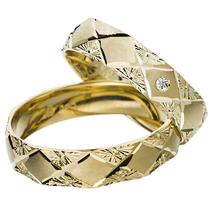 Vielsesringe i 8 eller 14 kt. Guld fint mønster. Overfladen er fin mat i længdegående retning og højglans poleret.